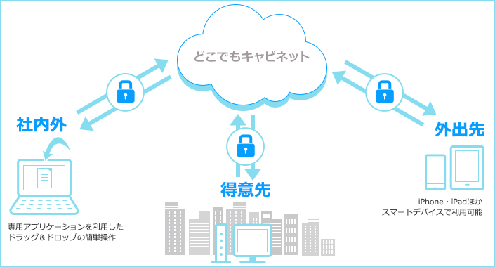 「どこでもキャビネット」は大きく分けて、「ファイル共有」、「ファイル送受信」、「名刺管理」の3つの機能を提供しています。マルチデバイス対応のサービスですので、PCはもちろん、iPhone、iPadなどのスマートデバイスでもご利用いただけます。社内にいても、外出先でもいつでもどこでも仕事ができるインフラを提供しています。