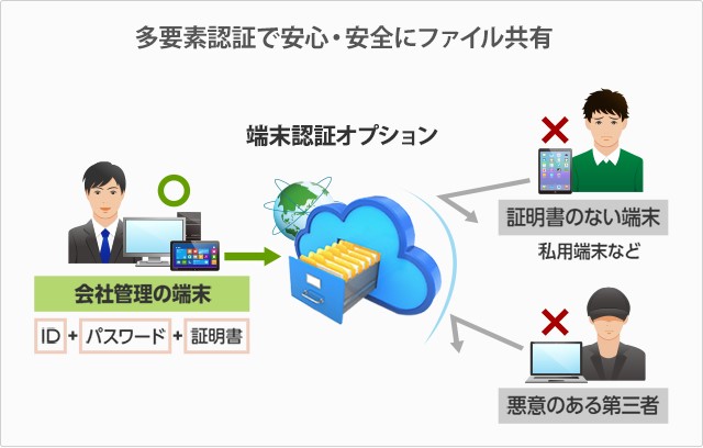 タブレット、スマートフォンがビジネスでも活用されはじめ、営業の担当者が外出先からこれらの端末を使って、オンラインストレージにアクセスするようになると、“なりすまし”などのセキュリティリスクが顕在化し、端末認証・利用端末限定のニーズが高まりました。