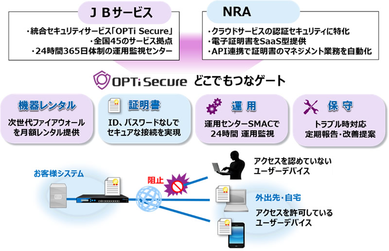 JBサービス株式会社では、JBグループ※1が「OPTi Secure」で提供するセキュリティ運用サービスに、VPN接続で利用する電子証明書「NRA-PKIクライアント証明書」を組み込み、働き方改革に最適なソリューション「OPTi Secure どこでもつなゲート」を提供しています。