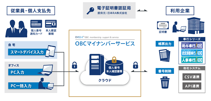 「OBCマイナンバーサービス」は、企業が必要とするマイナンバー対応業務を支援するクラウドサービスです。個人番号の収集・保管から利用・提供・廃棄まで、一連のマイナンバー業務に対応しています。