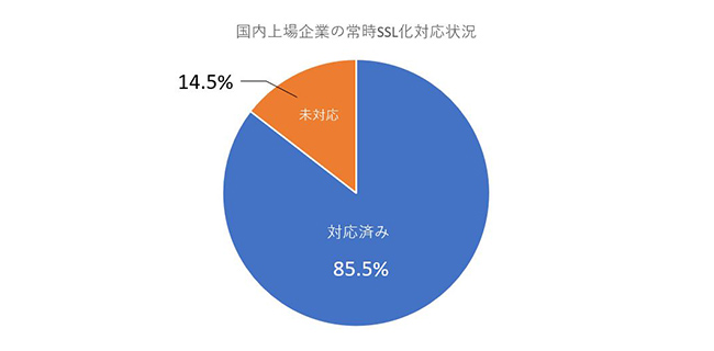 日本国内でも、大企業では常時SSL化が順調に進んできており、民間の調査では、2021年現在、上場企業のうち85.5%がすでに対応済みとなっています。