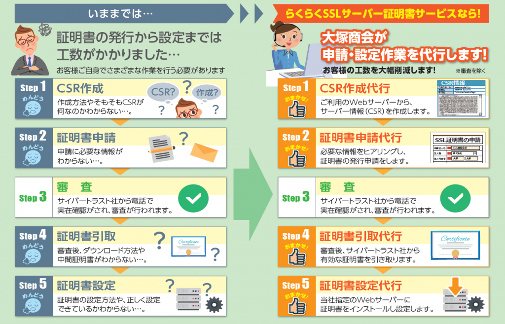 「らくらくSSLサーバー証明書」では、CSR作成、SSLサーバー証明書の発行申請、ダウンロード、Webサーバーへの設定などSSLサーバー証明書の導入に関わるほとんどの作業をお客様に代わって大塚商会が代行します。