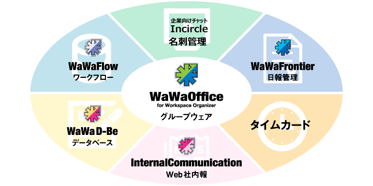 WaWaOfficeはグループウェアを中心に、営業担当者の行動管理を行うSFAサービスや申請業務の効率化を行うワークフローサービス、様々なアプリをお客様で自由に作成できるデータベースサービスなど、豊富なサービスを連携して活用ができる自社開発のクラウドサービスです。
