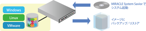 また、オフラインでのシステムイメージバックアップに限定し、CUIイメージで単純操作が可能です。サーバを停止した状態で、Linuxベースの専用ライブCDでブートし、静的・確実にバックアップ及びリストアを行います。