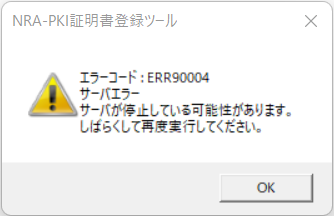 プロキシサーバやセキュリティソフト等が原因で上記URL(NRA-PKIシステム)へのアクセスができない場合にエラーが発生する可能性があります。