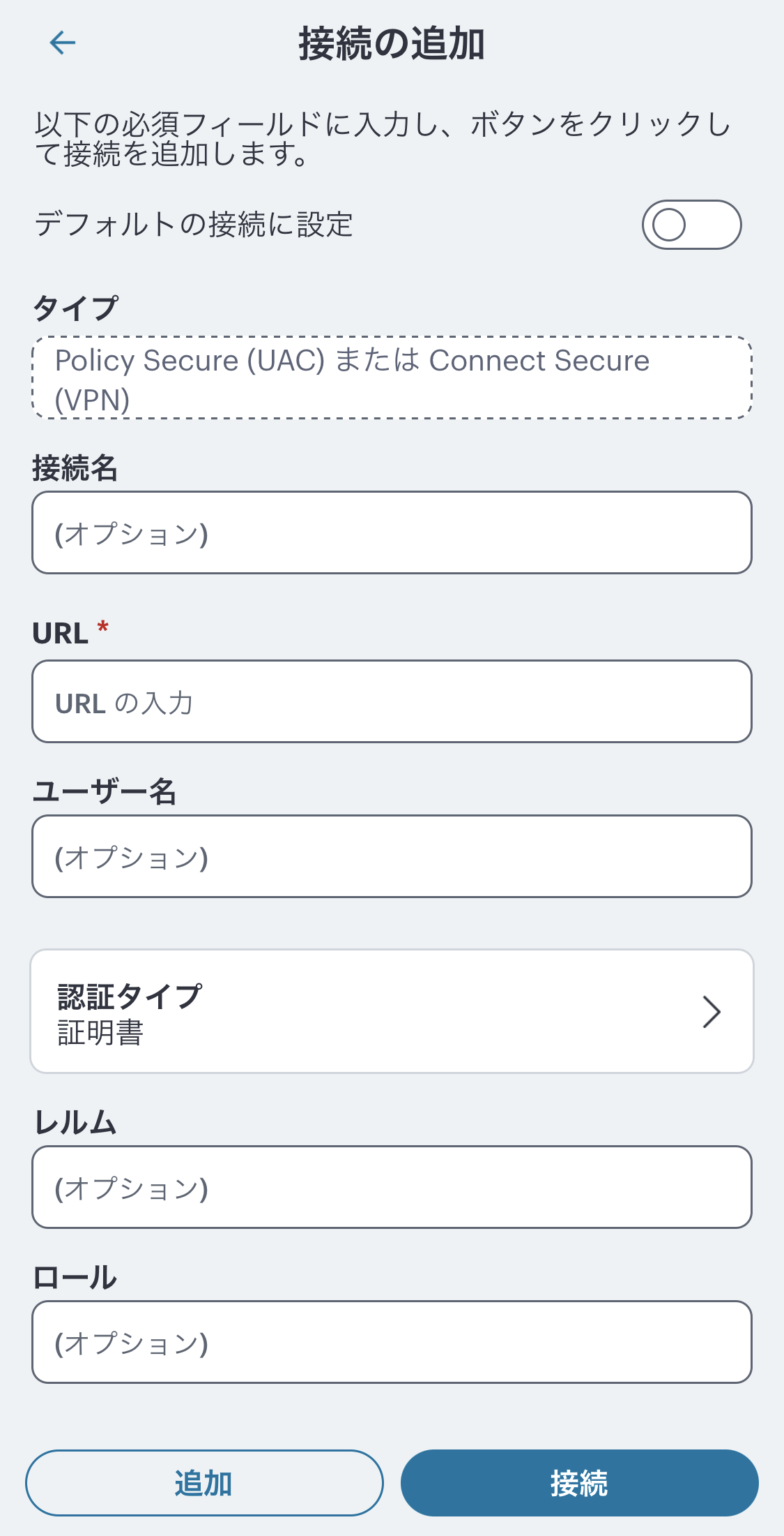 新しい接続を追加していただき、各項目の入力と認証タイプに任意の証明書を選択してお試しください。