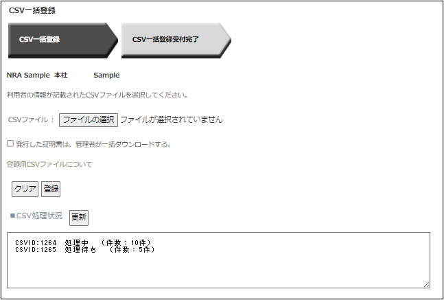 CSV一括登録、CSV一括失効、CSV一括再発行、CSV一括利用者マスター削除のCSVファイルを登録する画面に現在の待ち状況が表示されるようになります。