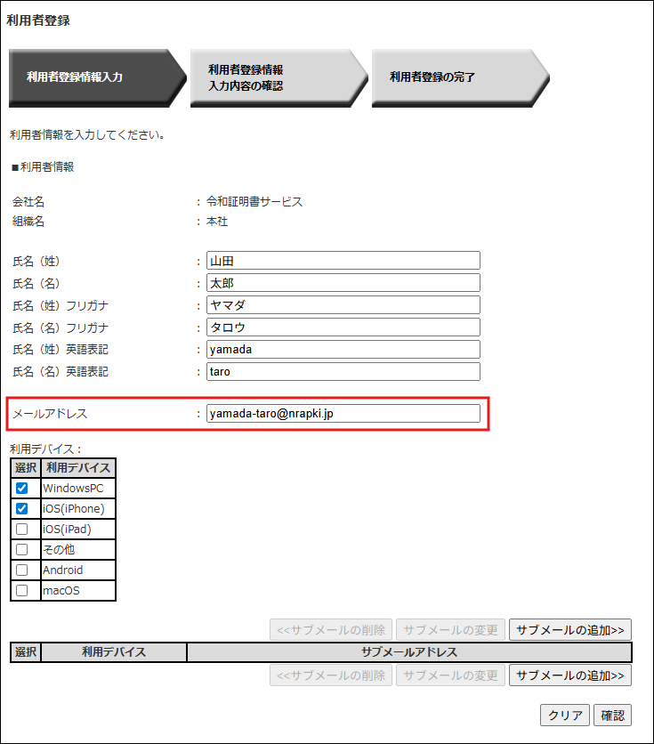 NRA-PKIシステムでは、利用者の識別を代表メールアドレスで行っております。