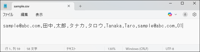 - テキストエディタ(メモ帳等)でファイルAを開き、カンマ区切りでデータを入力し保存する