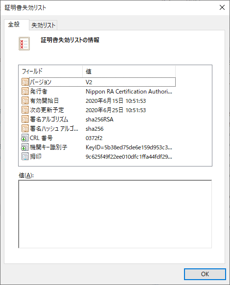 CRLリストの有効期間は10日間で、下図がCRLファイルのプロパティになります(以下の通り情報が格納されます)。