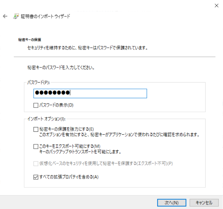 5.[パスワード]に秘密の鍵(PIN)を入力し、[次へ]をクリックします。