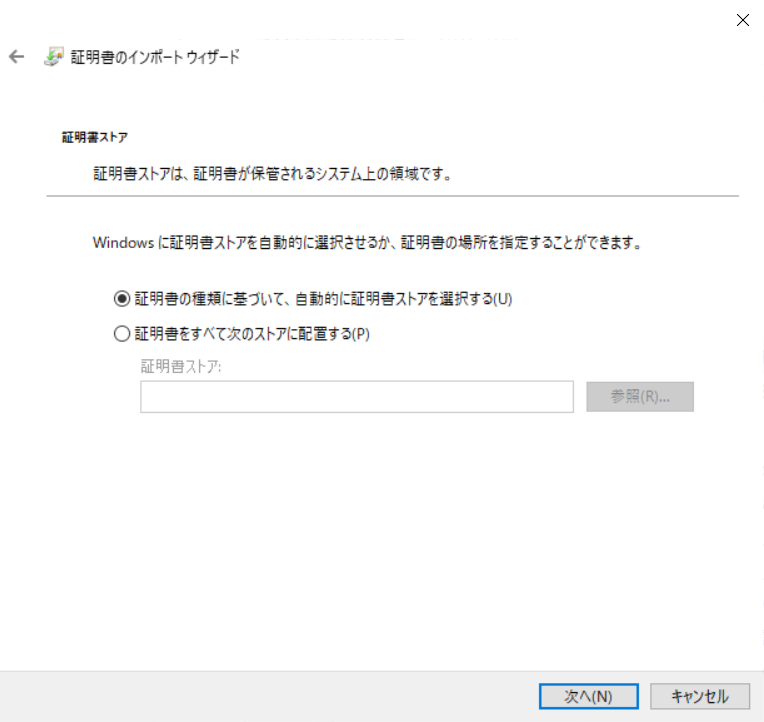 6.[証明書の種類に基づいて、自動的に証明書ストアを選択する]が選択されていることを確認し[次へ]をクリックします。