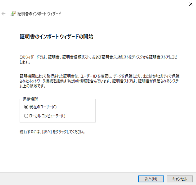 2.証明書のインポートウィザードが起動します。
