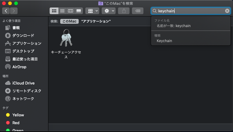 (コマンド⌘キー+スペースキーにてSpotlightの検索画面が表示されますので、”キーチェーン”と入力して「キーチェーンアクセス.app」を選択し起動してください)