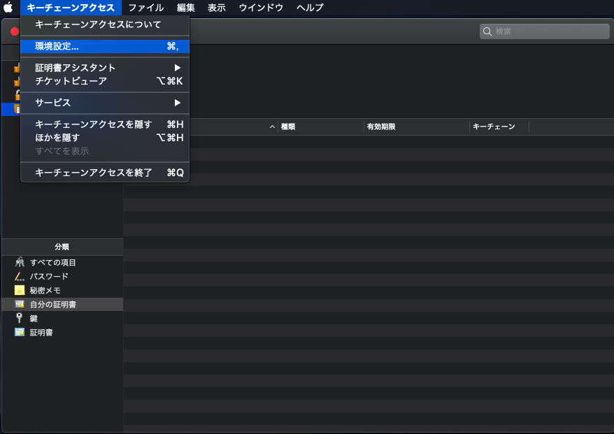 - [キーチェーンアクセス]⇒[環境設定]の順にクリックします。