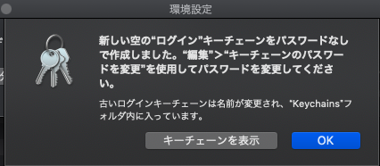 - ここまででキーチェーンのリセットは完了です。その後、改めて証明書のインストールを行うと格納場所を選択できるようになります。