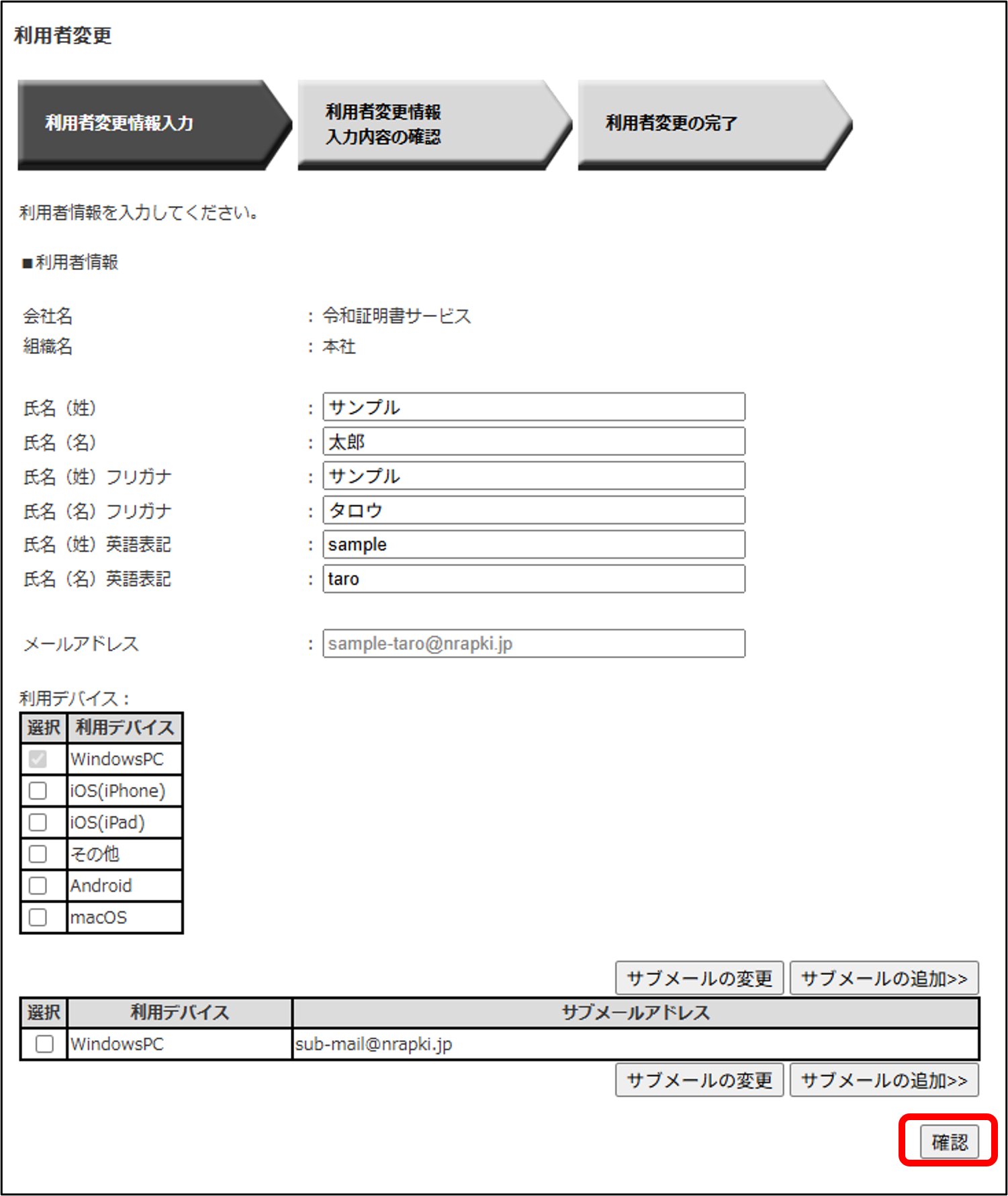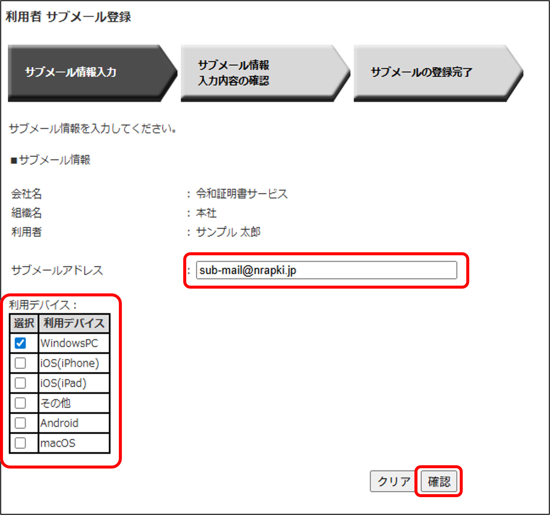 - 「利用者 サブメール登録」のポップアップウィンドウが表示されるので、「サブメールアドレス」の欄に追加したいデバイスのメールアドレスを入力し、利用デバイスを選択後に[確認]をクリックします。