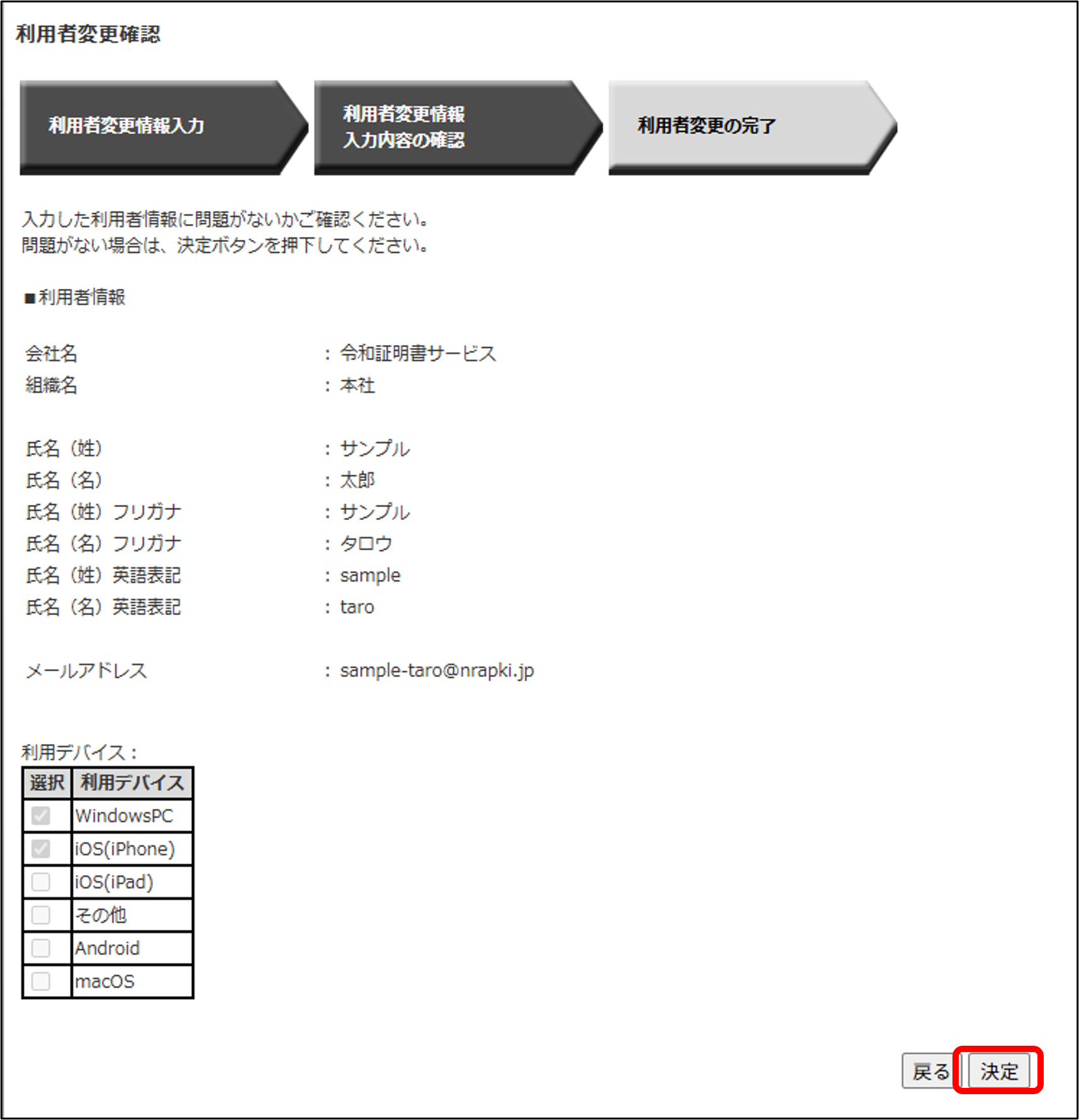 - 「利用者変更確認」のポップアップウィンドウが表示されるので、[決定]をクリックします。