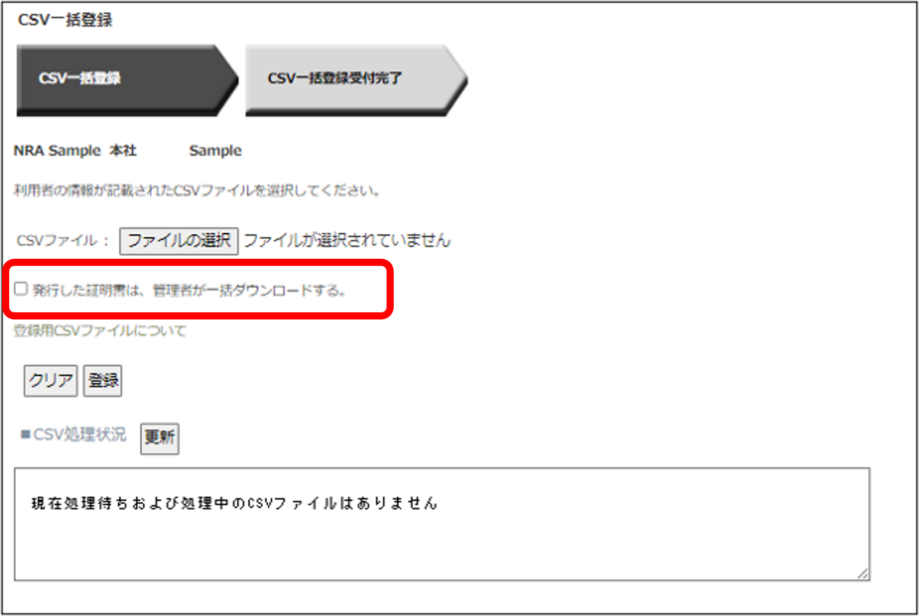 CSV一括登録をすることにより管理者がまとめてクライアント証明書をダウンロードすることができます。その際は[発行した証明書は、管理者が一括ダウンロードする]のチェックボックスにチェックをいれてご登録ください。詳細は以下リンクより【NRA-PKI】利用法人管理者マニュアルをご確認ください。