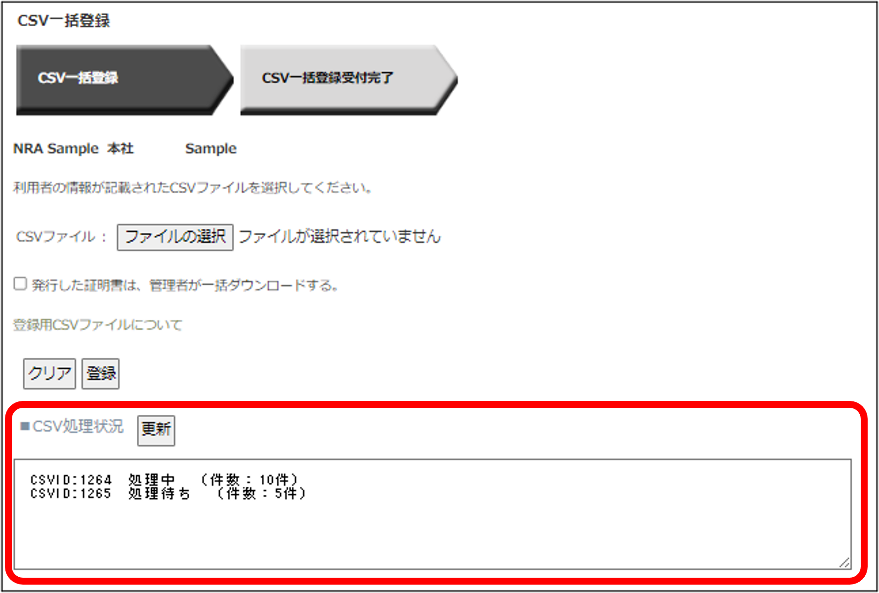 ※CSV一括登録画面よりCSV処理状況をご確認いただけます。「更新」ボタンを押下すると画面がリロードされ、最新の待ち状況が表示されます。