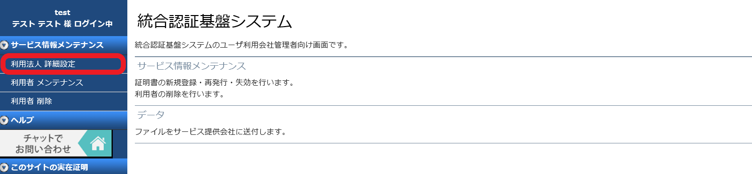 - 管理画面から「サービス情報メンテナンス」-「利用法人 詳細設定」を選択します。
