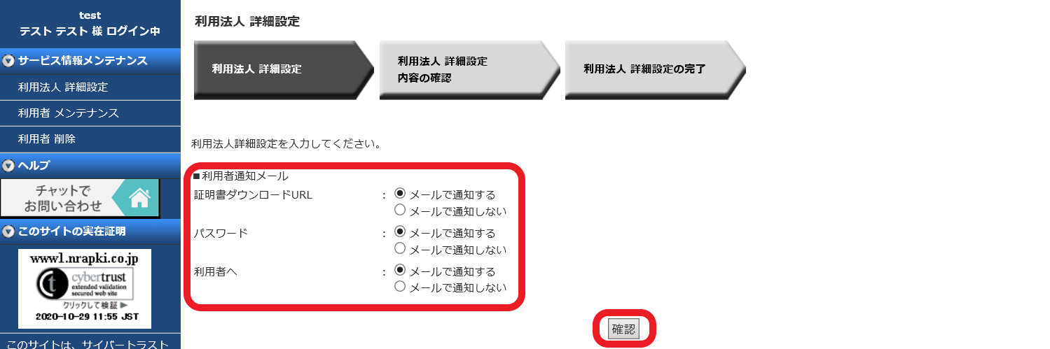 - 利用者通知メールを任意の設定で選択し「確認」をクリックします。